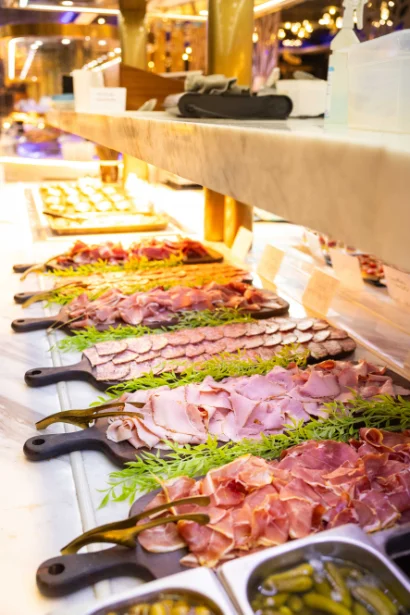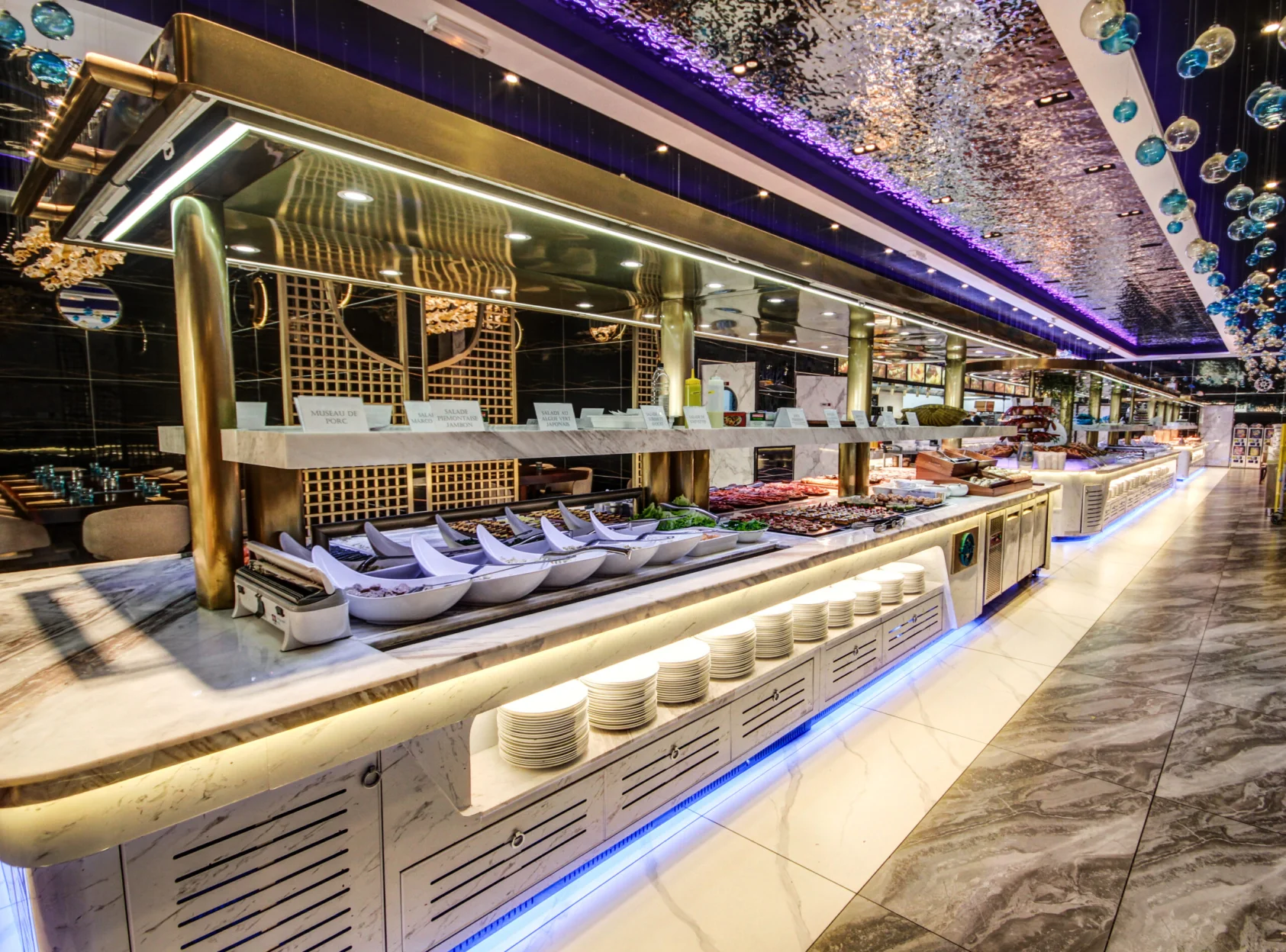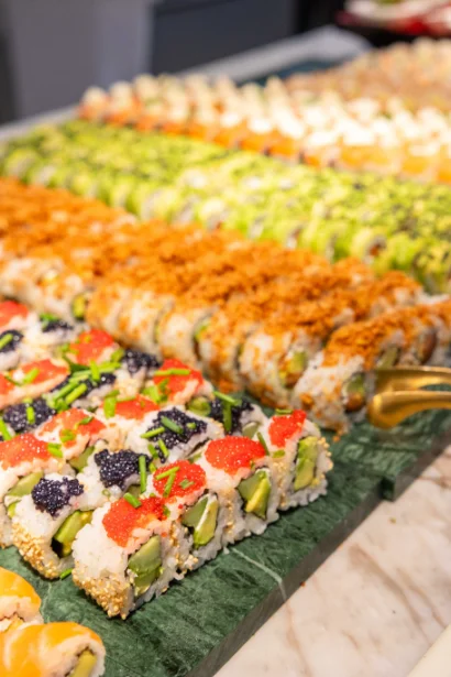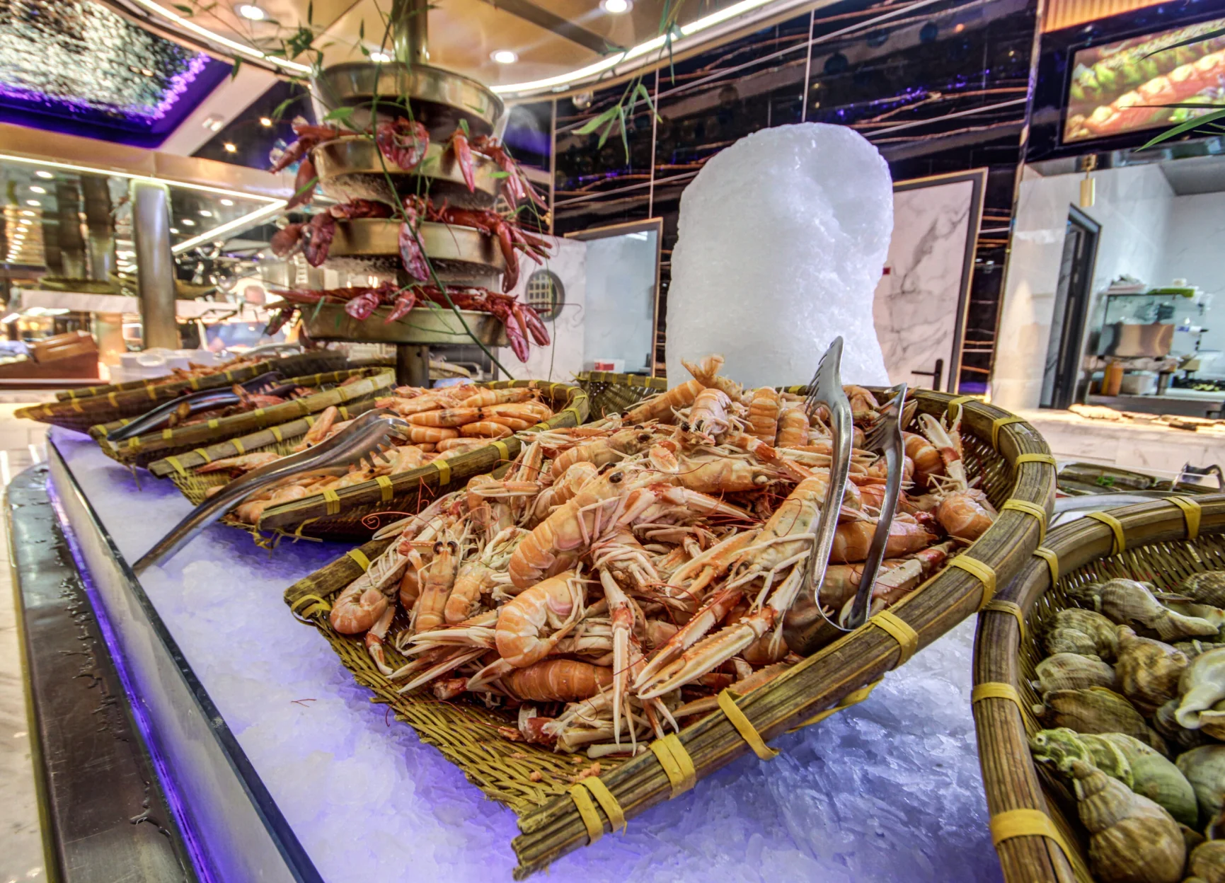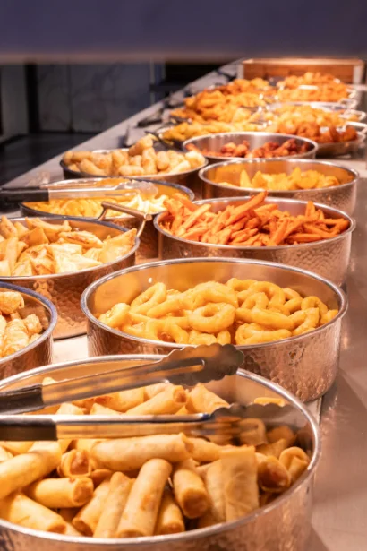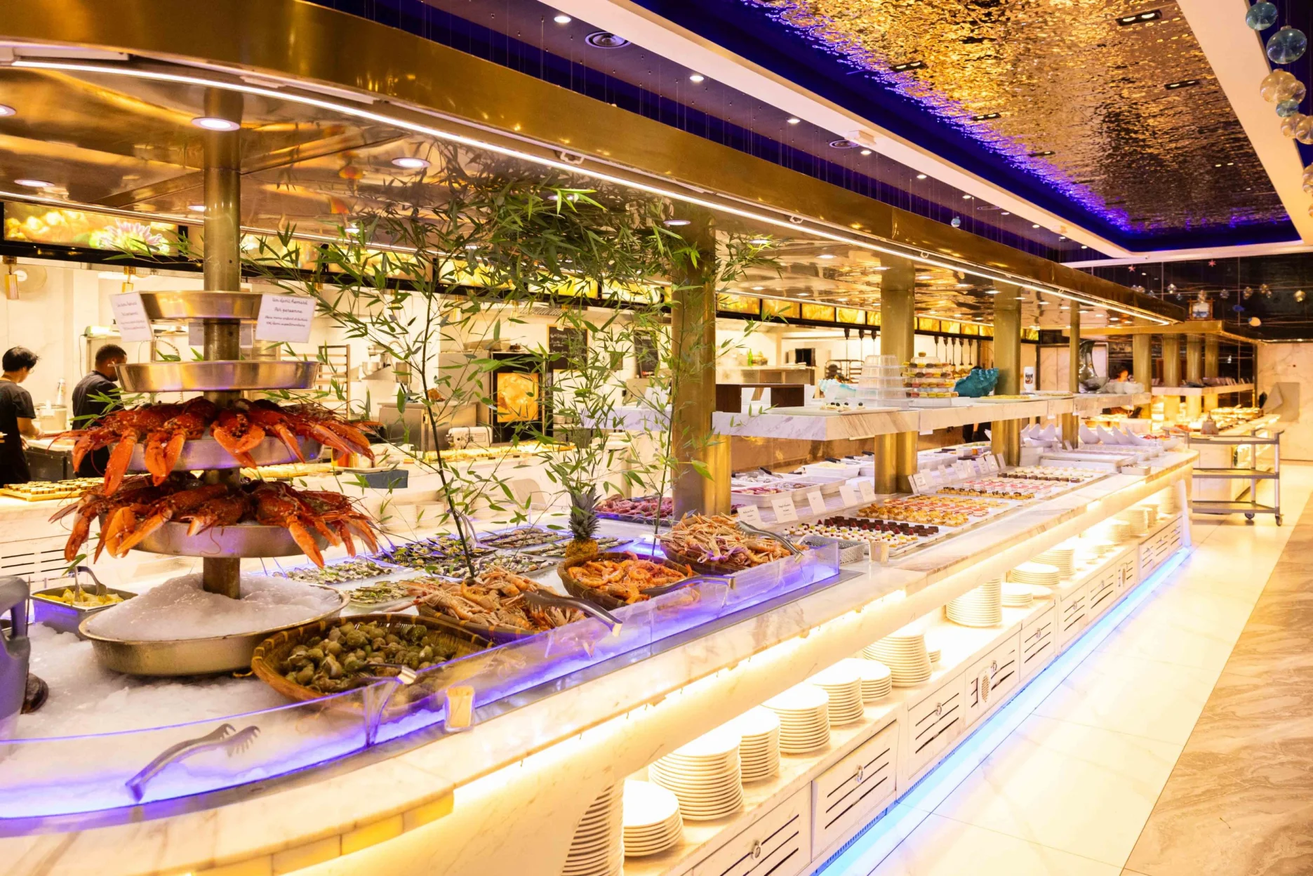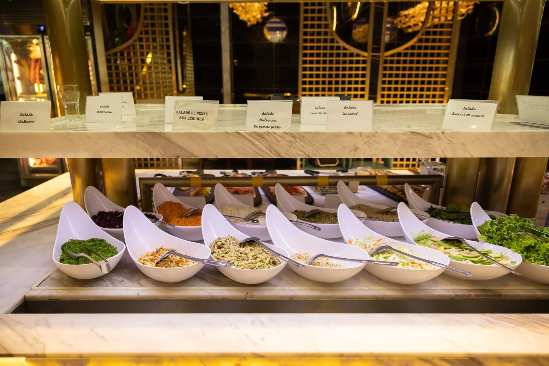 Plusieurs îlots sont à votre disposition : cuisine chinoise, japonaise, rôtisserie, bar à dessert… des mets cuisinés sur place avec des ingrédients frais et locaux.
